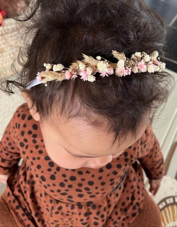 Satijnen diadeem met witte/roze droogbloemen voor kinderen.