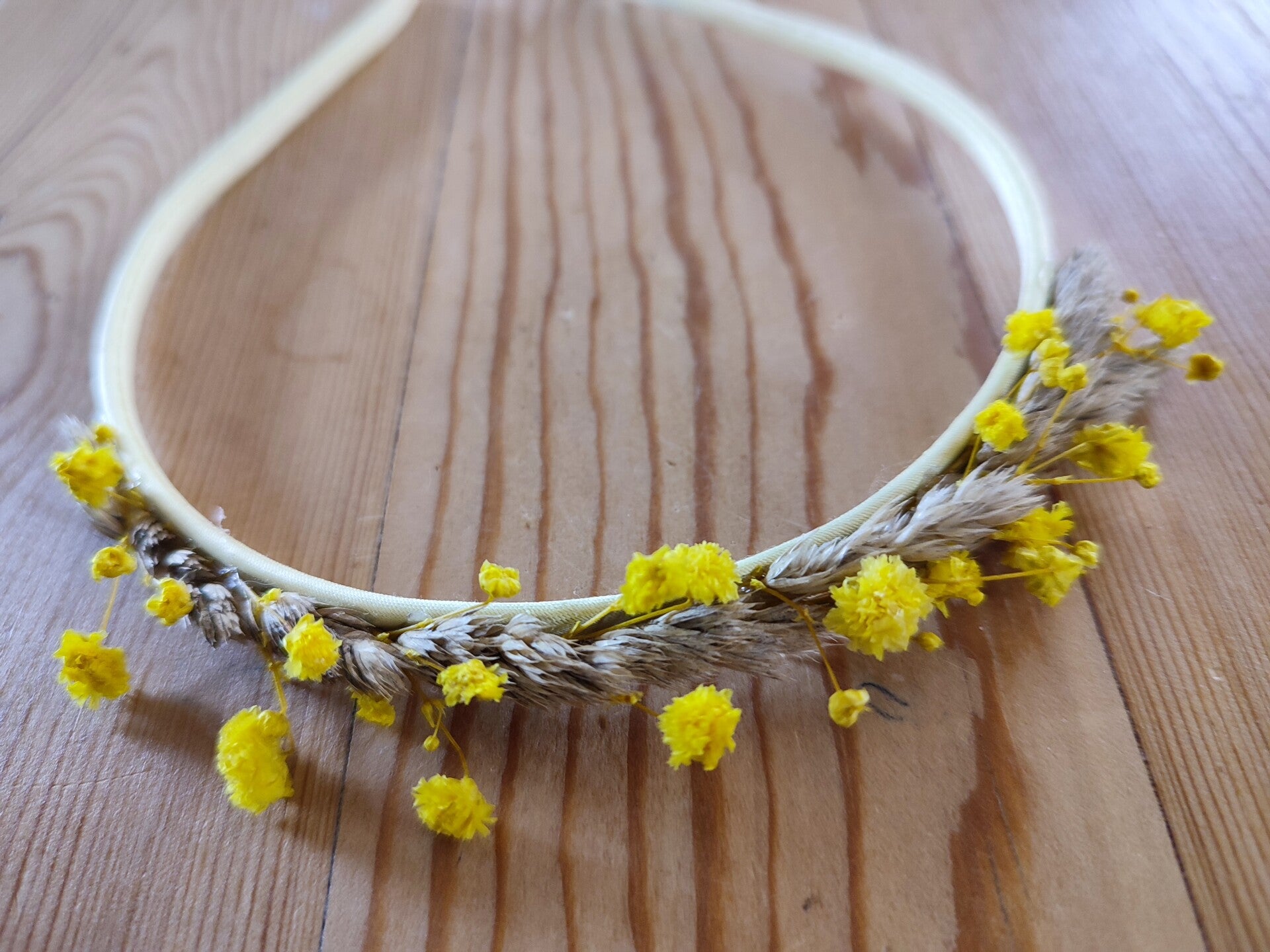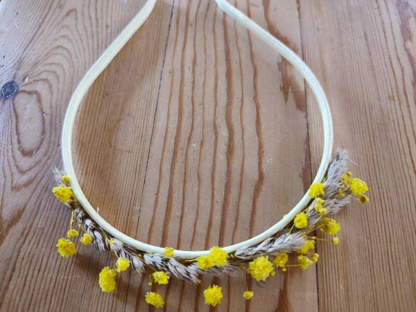 Satijnen diadeem met gele droogbloemen voor kinderen.