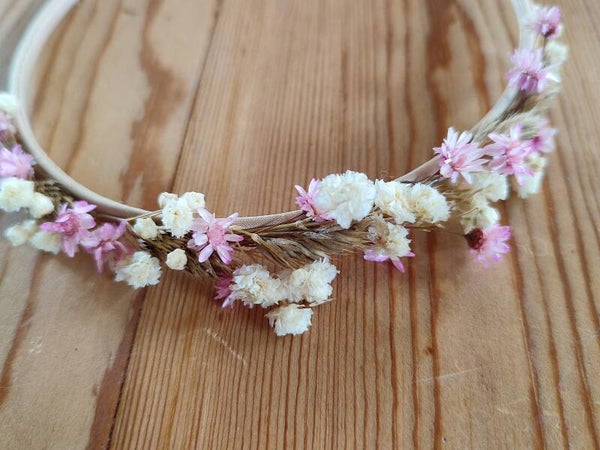 Satijnen ecrukleurige diadeem met witte/roze droogbloemen voor kinderen.