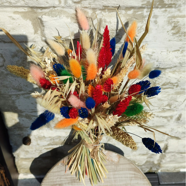 Droogboeket met fleurige kleuren, met oa. gedroogde phalaris, lagurus, avena,...