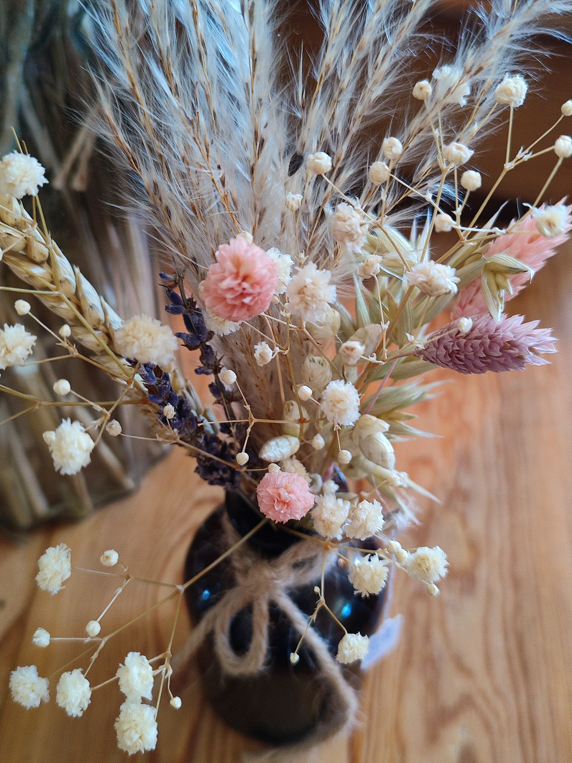 Apotheekvaasje met droogbloemen, vaasje 11cm hoog ,totale hoogte +-25cm