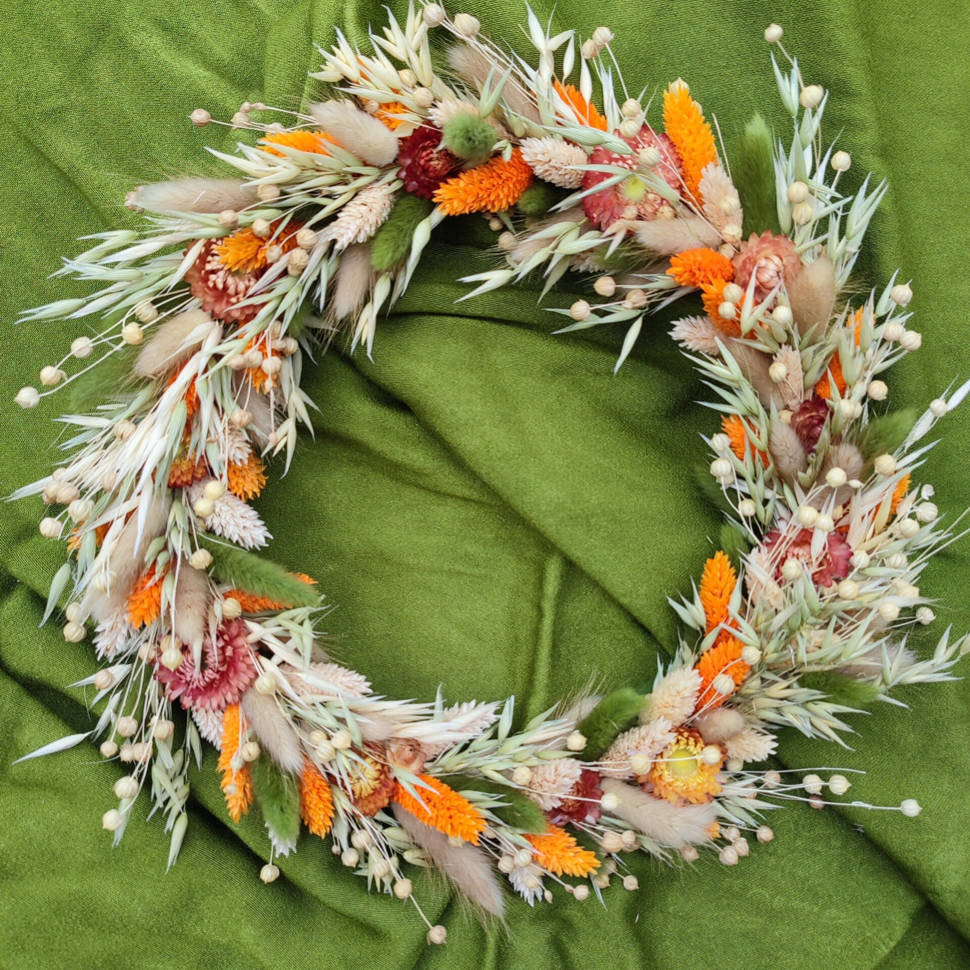 Droogbloemenkrans diameter 30cm, rondom rond gevuld met droogbloemen.