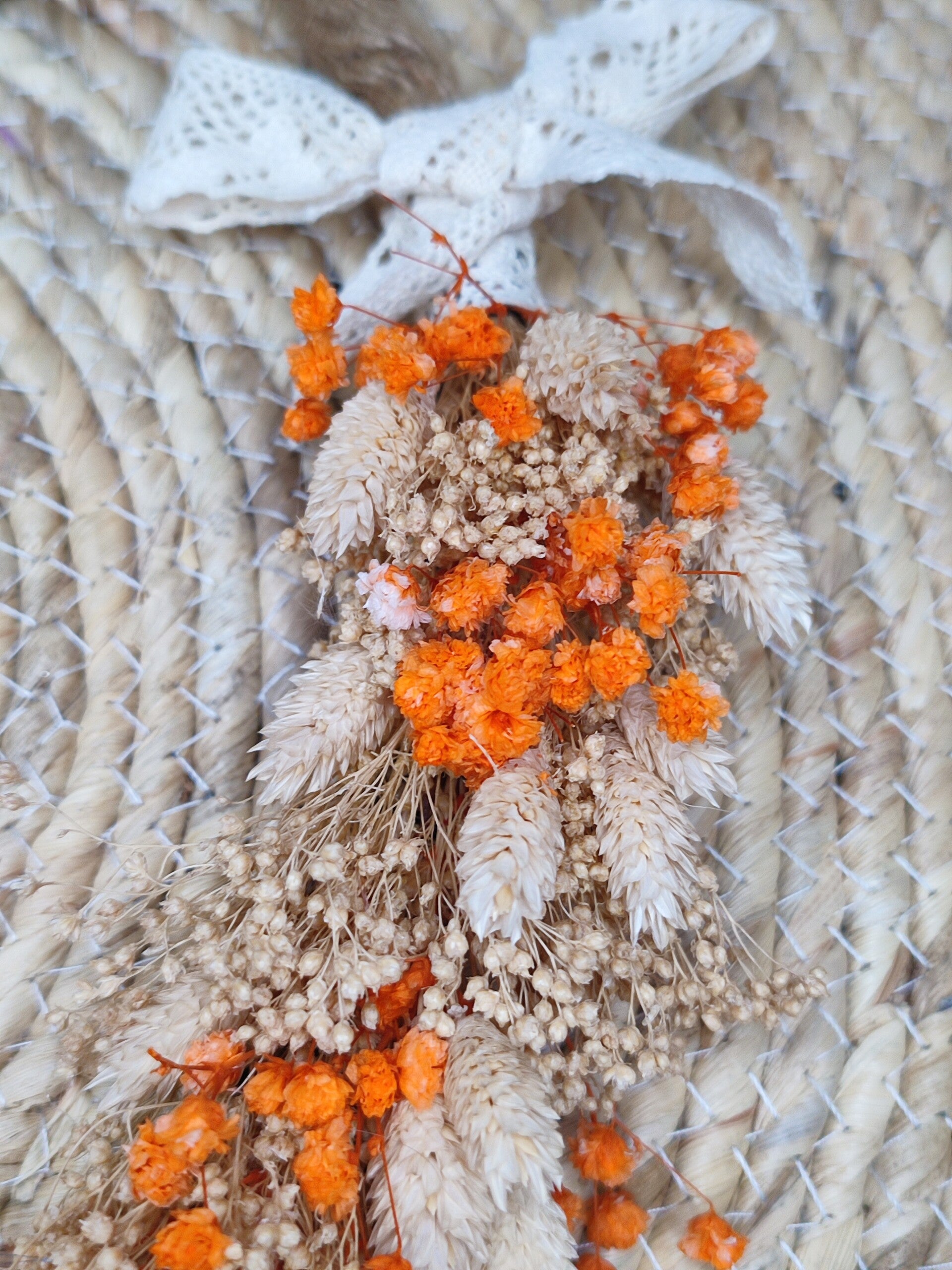 Droogbloemenkrans naturel met oranje accenten, met oa. gedroogde phalaris, gipskruid,..