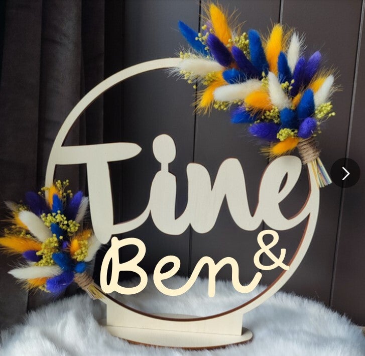 Naamcirkel gepersonaliseerd met 2 namen (excuses voor de getruceerde foto, echte foto volgt nog), diameter 30cm, dikte 6mm op standaard, met 2 toefjes droogbloemen. Mogelijk als staander of omhoog te hangen.