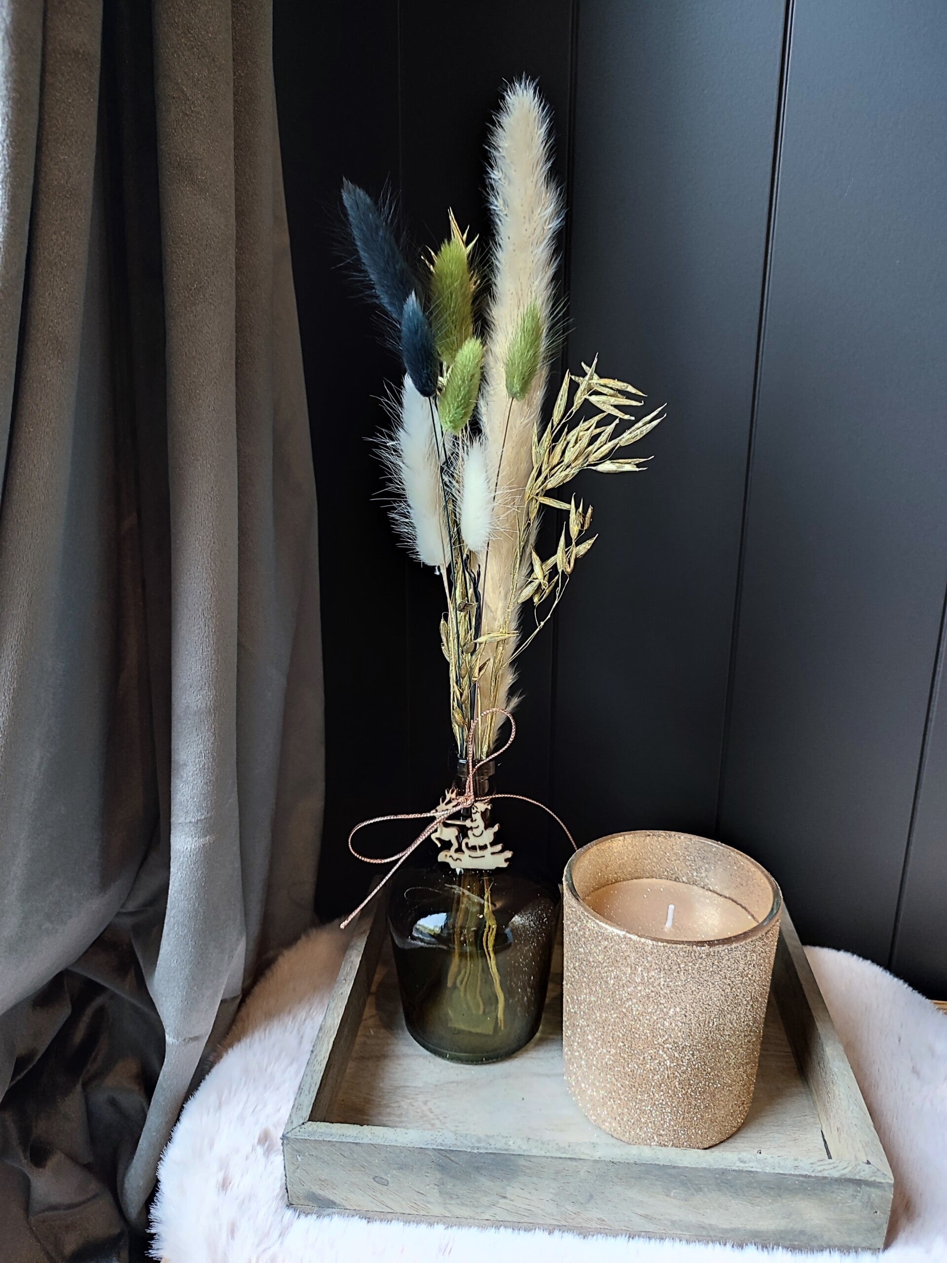 Houten dienblad (22x18x4cm) met geel gouden kaars en vaasje met droogbloemen.