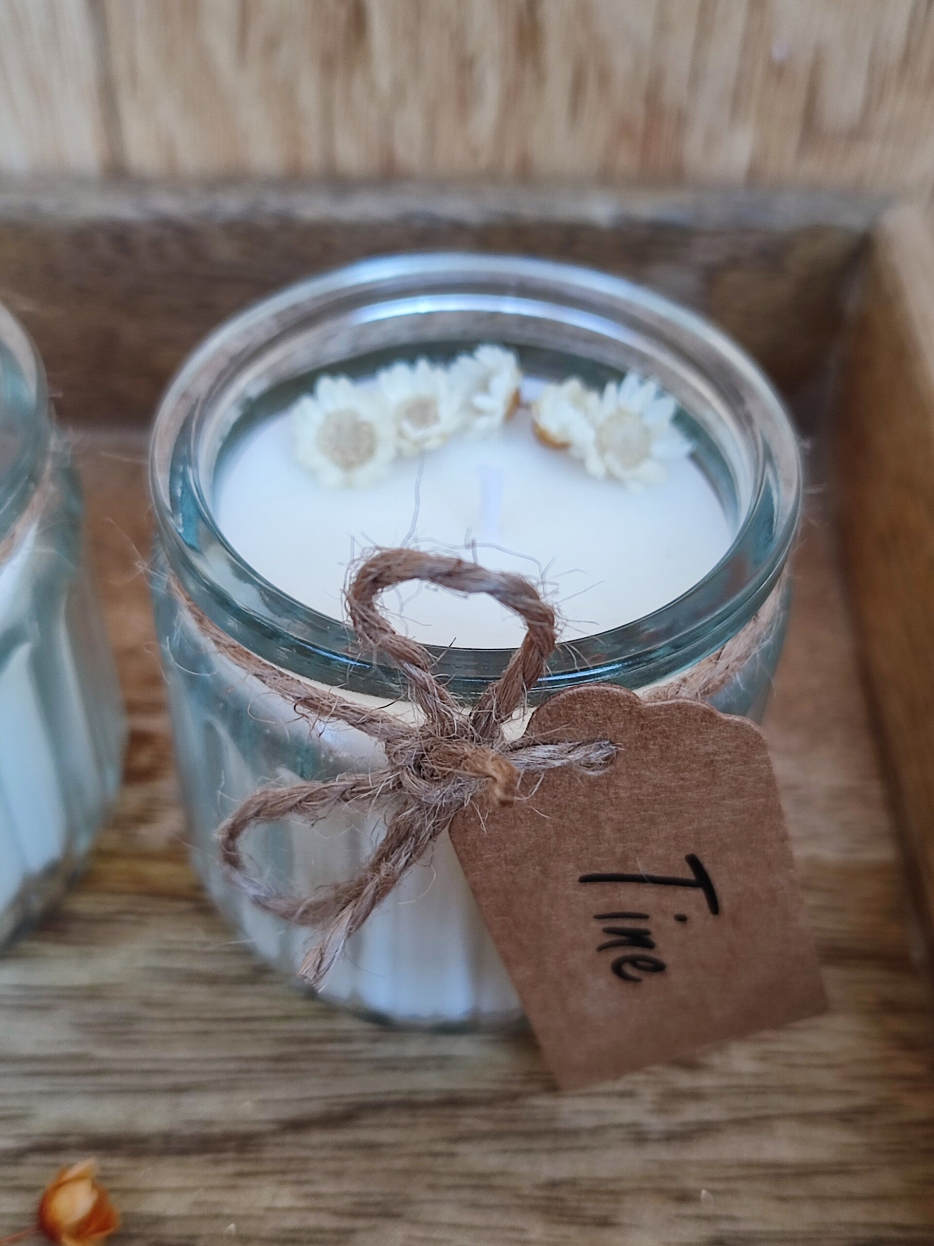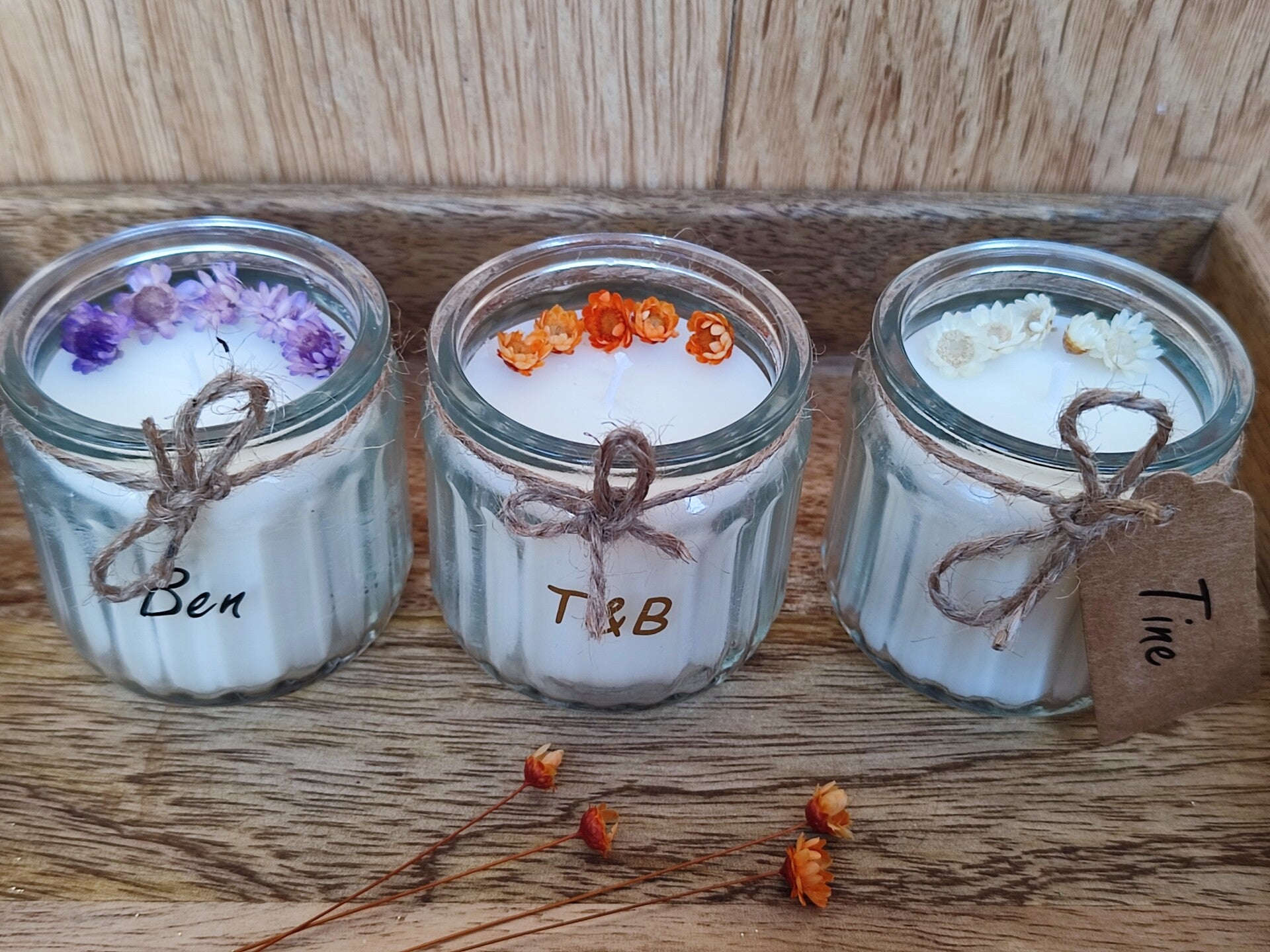 Mini geurkaarsje in glazen geribbeld potje met droogbloemen in kleur naar keuze.