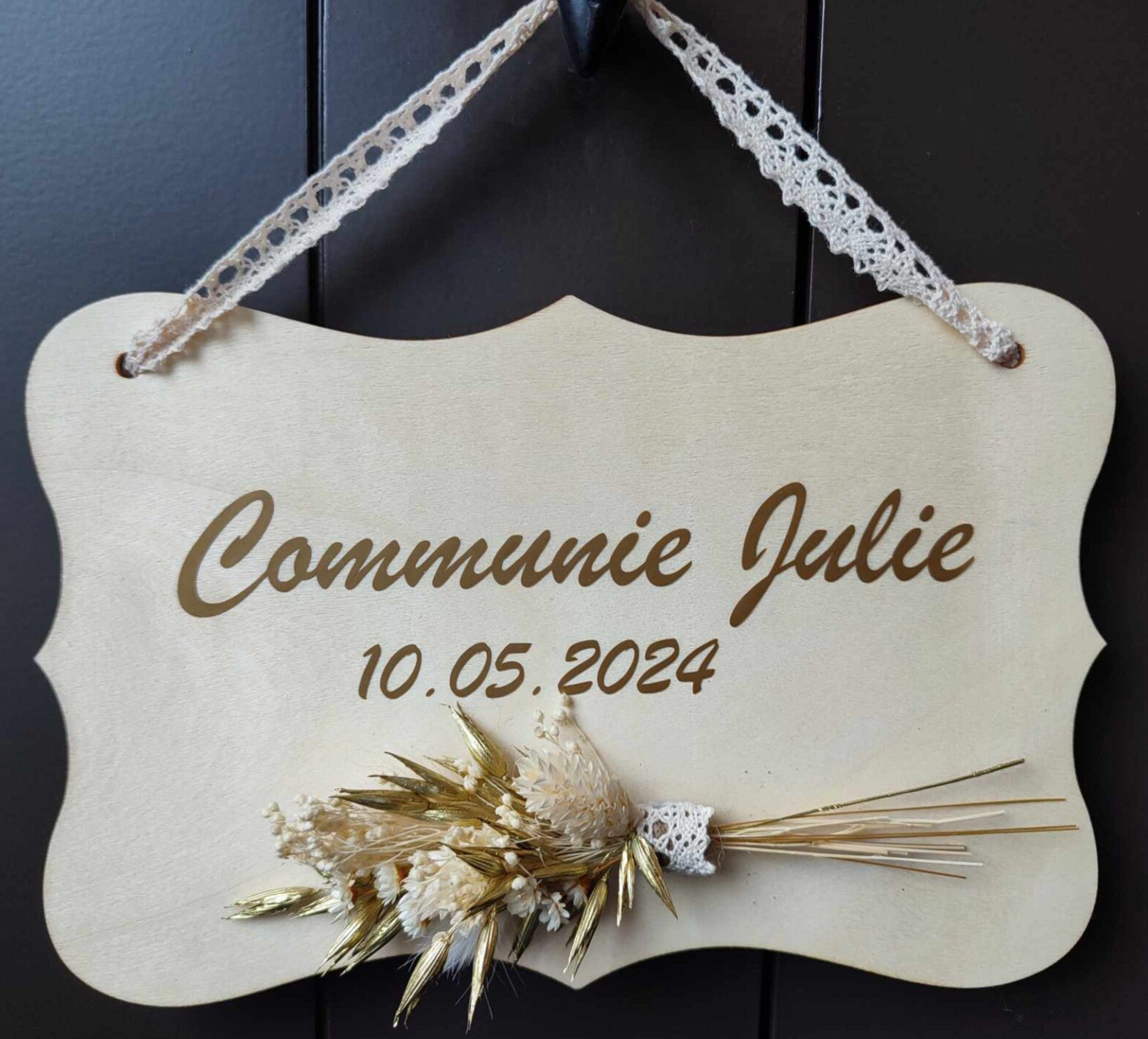 Houten welkomstbord (22cmx14cm), met droogbloemen, tekst kan in goud of zwart. Kan ook bijvoorbeeld met andere tekst voor geboorte (met datum en naam), voor trouw welkom op ons feest (met datum en initialen).... Vele mogelijkheden. Hoe langer de tekst uiteraad hoe kleiner die wordt.
