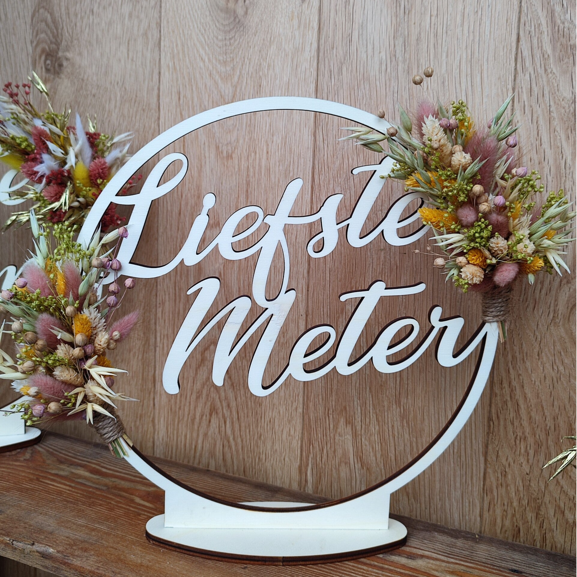 Naamcirkel Home sweet home om omhoog te hangen met 2 toefjes droogbloemen (ook in versie staander mogelijk), diameter 30cm, dikte 6mm.