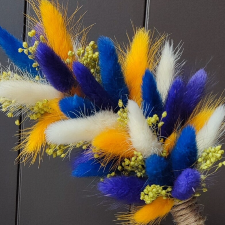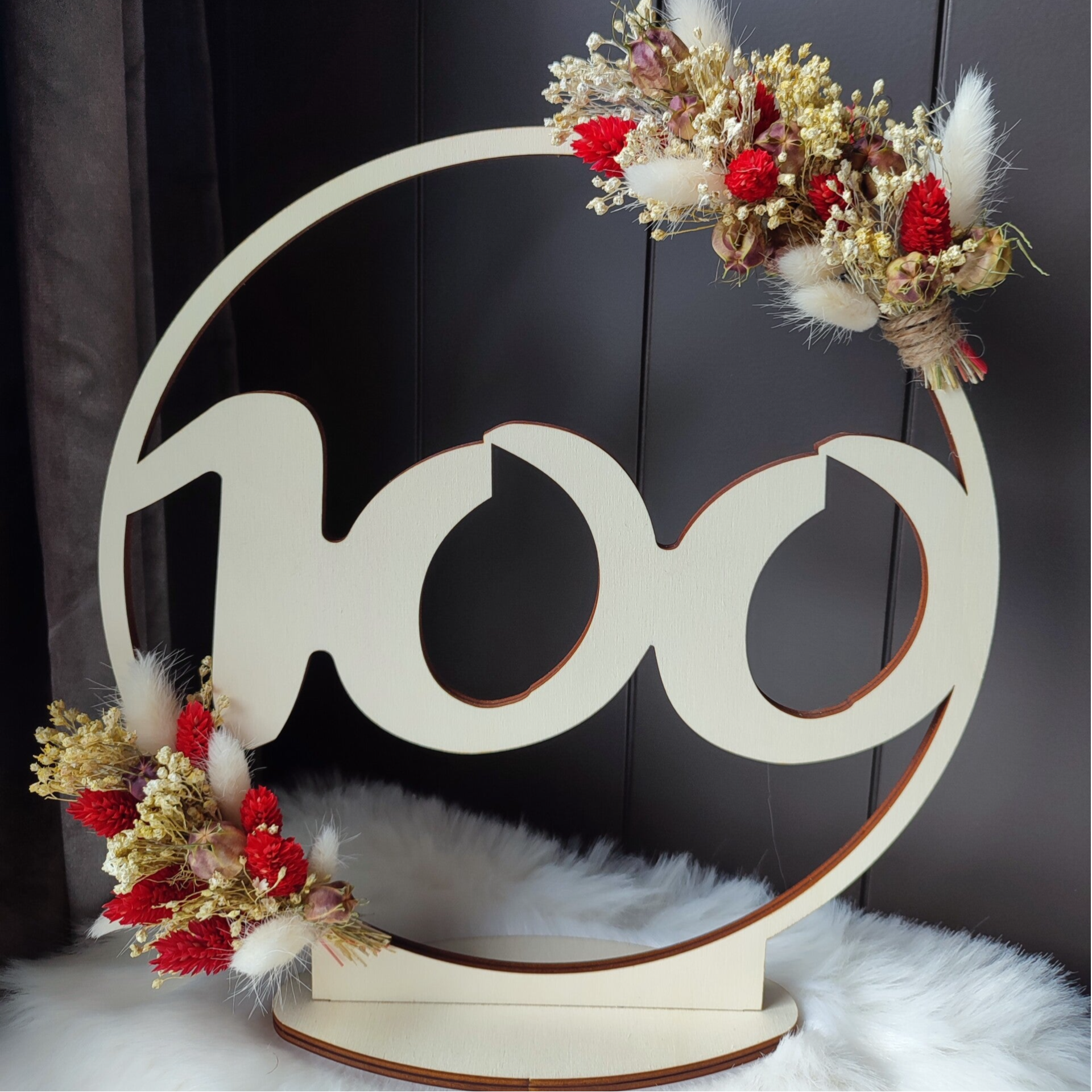 Naamcirkel gepersonaliseerd met cijfer erin, diameter 30cm, dikte 6mm op standaard, met 2 toefjes droogbloemen. Mogelijk als staander of omhoog te hangen. Kan ook in 40cm, neem daarvoor contact op. (De 2e foto bevat blauw maar ook blauwpaars, wat moeilijker zichtbaar is maar toch wil ik dit hierbij vermelden.)