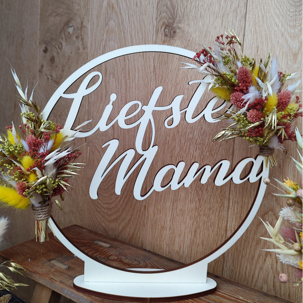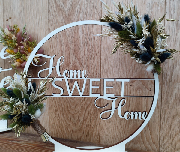 Naamcirkel Home sweet home om omhoog te hangen met 2 toefjes droogbloemen (ook in versie staander mogelijk), diameter 30cm, dikte 6mm.