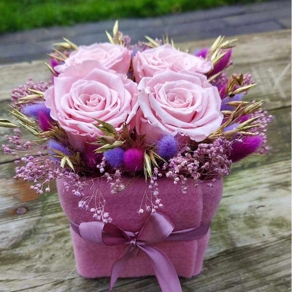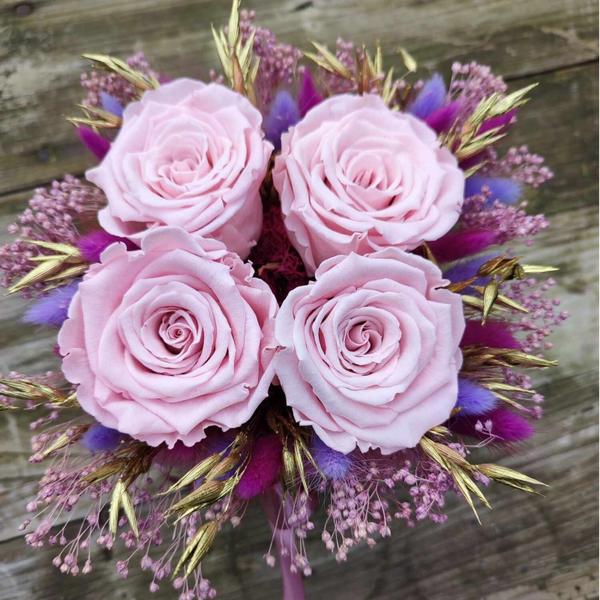 Droogbloemenstuk met 4 gepreserveerde rozen,