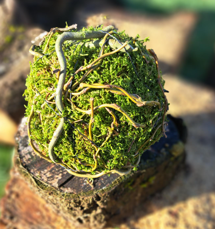 Bol met vers groen mos, diameter 15 cm, omwikkeld met krulwilg takken.