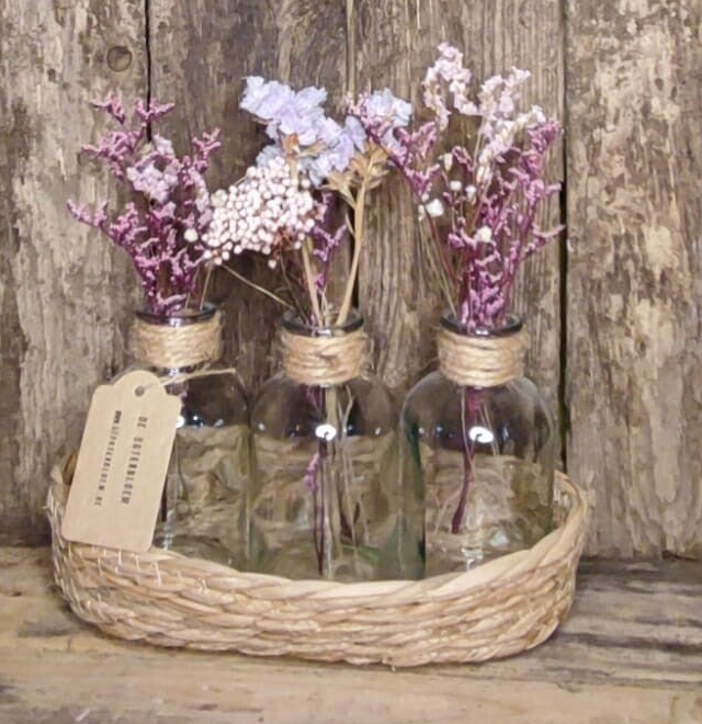 Gevlochten rieten mandje met 3 glazen vaasjes gevuld met droogbloemen.