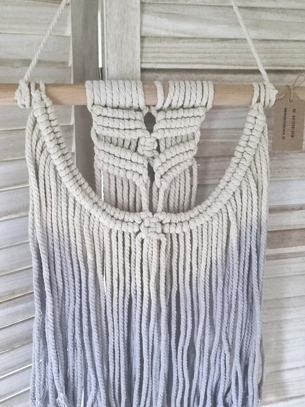 Wandhanger gemaakt in dik ecru macramedraad. Gaat van effen ecru over in kleur lichtlila naar de onderzijde toe.