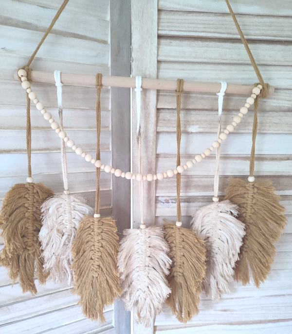 Macrame wandhanger met veren en houten kralen, in oker en ecru tinten. Naturel look / bohemian style.