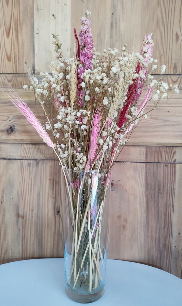 Landelijk roze droogboeket met oa. wit gipskruid.