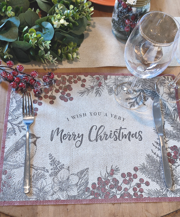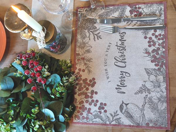 6 stuks placemats met patroon botanische kerst, combineerbaar met dezelfde servetten.