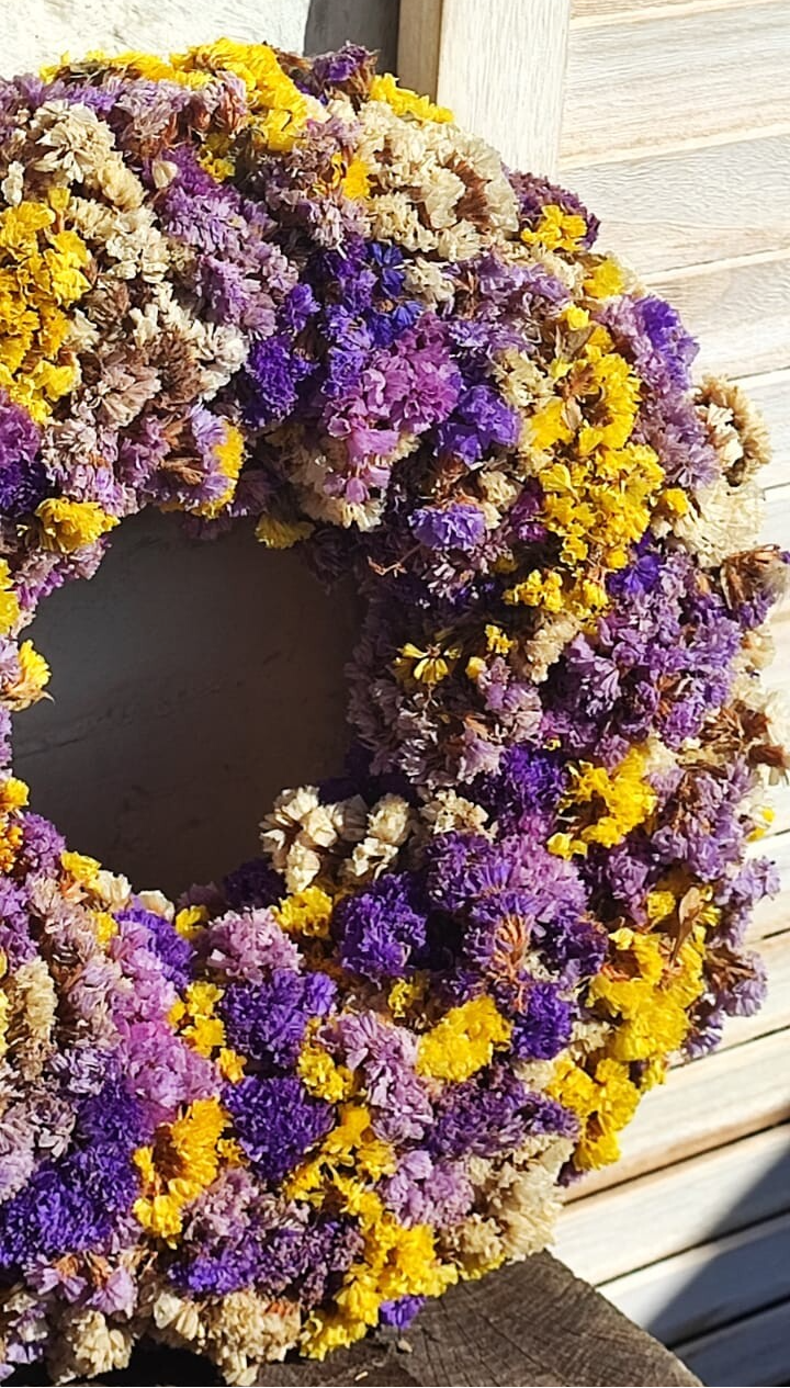 Krans van droogbloemen ,in tinten wit/geel/paars , diameter 35cm