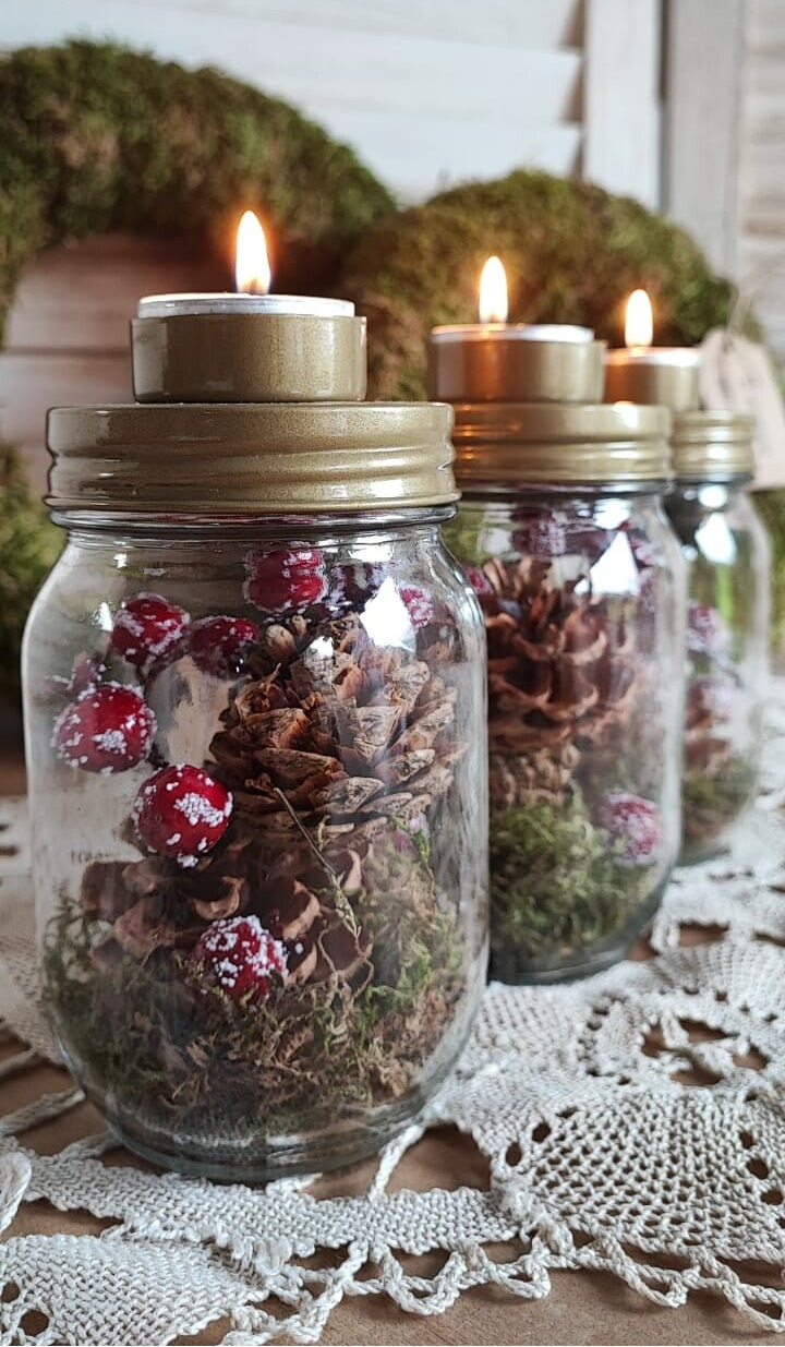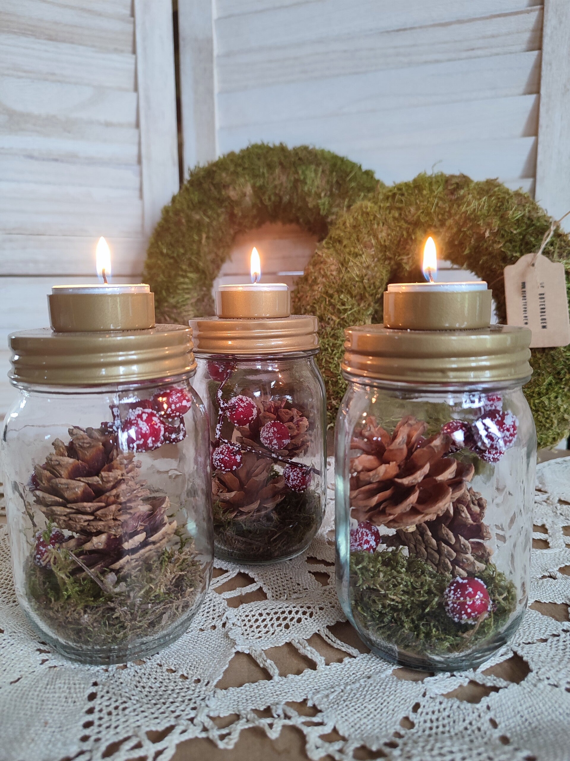 Theelichthouder in glas met gouden deksel gevuld met gedroogd mos, dennenappels en kunstbessen, inclusief theelichtje.
