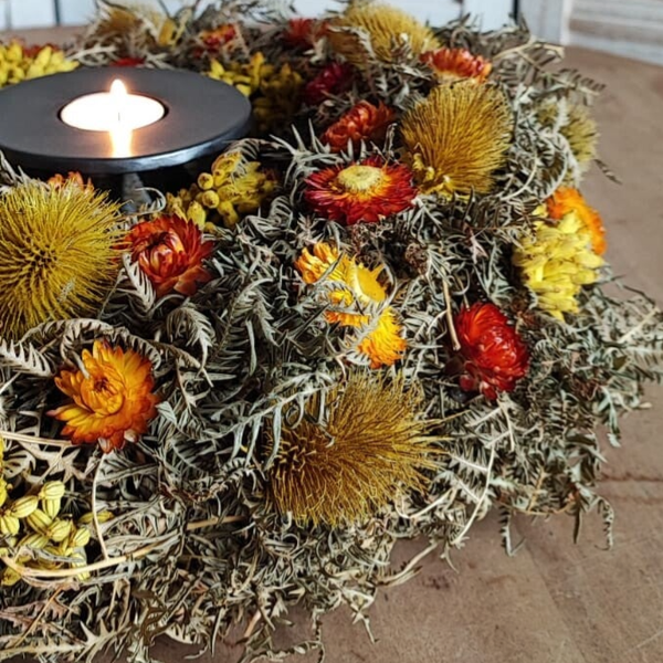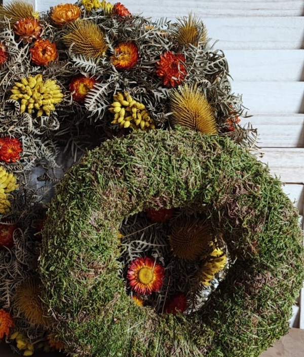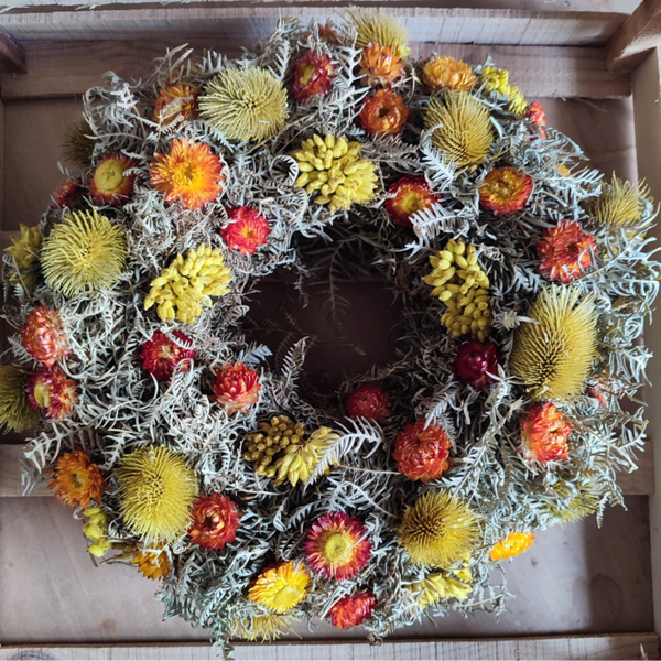 Droogbloemenkrans met oa.oranje helichrysums.