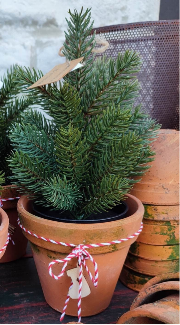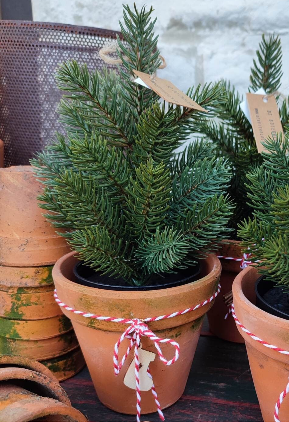 Kerstboom in kunststof in terracottapot, hoogte 27cm, diameter 11.5cm. Houten decoratiehangertje kan verschillen.