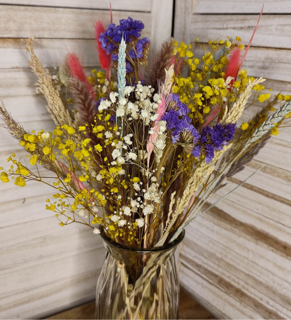 Kleurrijk boeketje met oa. gipskruid, tarwe, lagurus, enz.