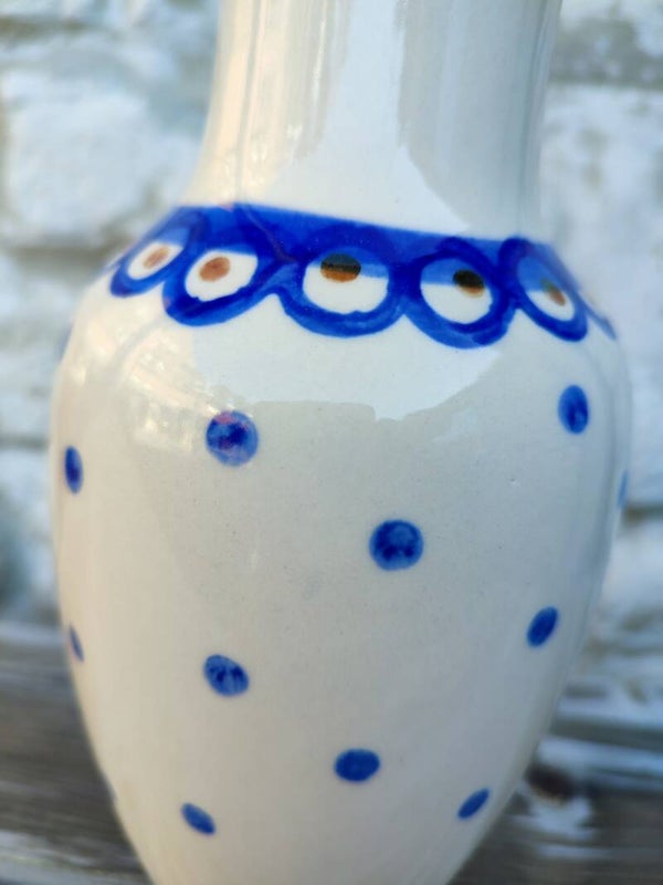 Keramieken geglazeerde ecru vaas met stippenpatroon en blauwe cirkels.