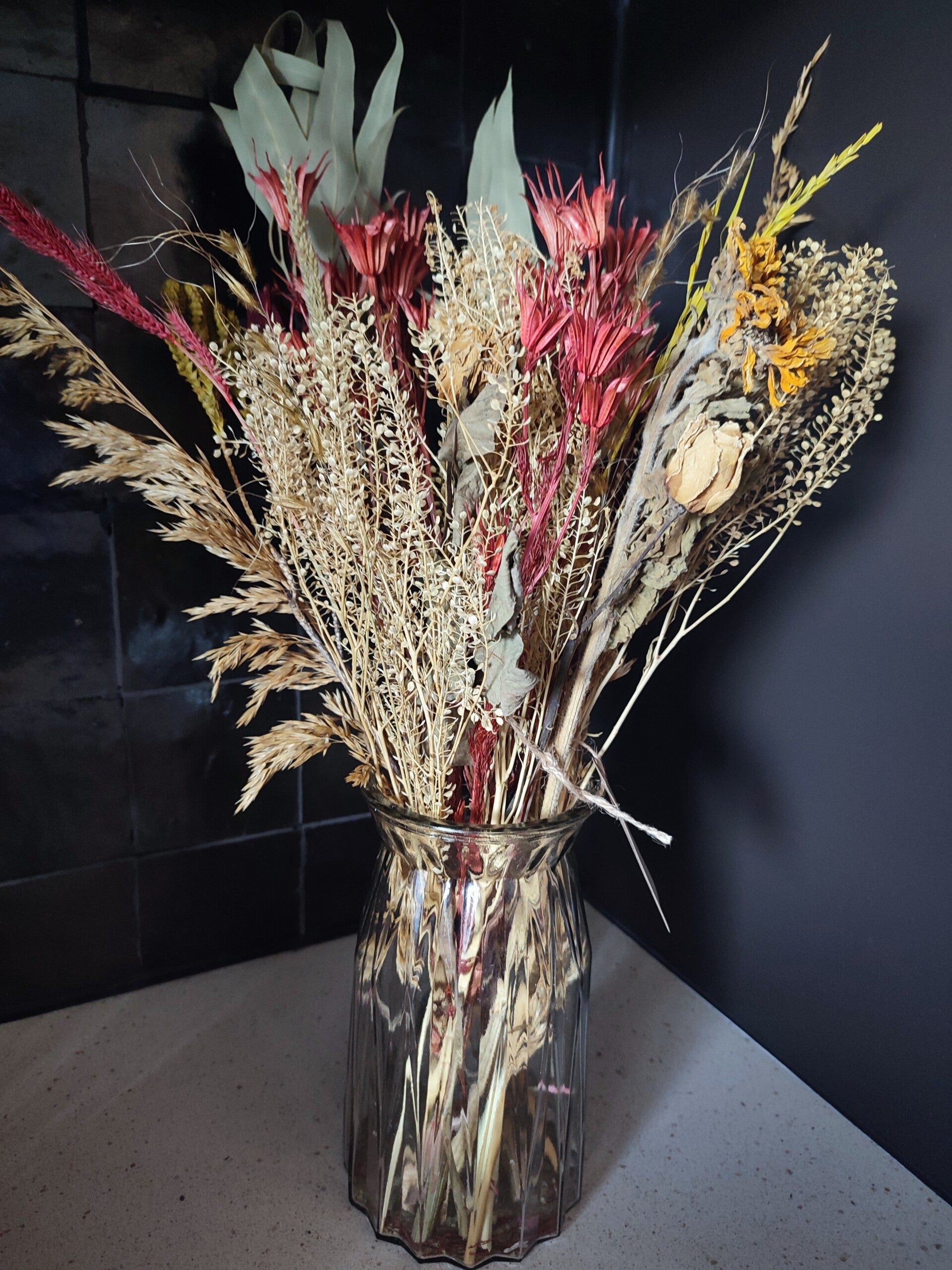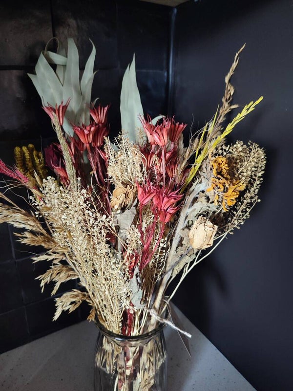 Droogboeket in naturel tinten met rode accenten.