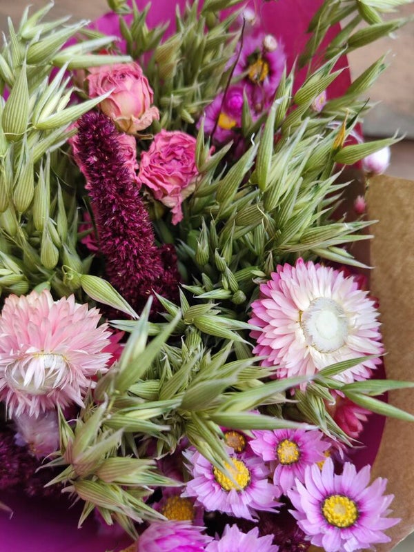 Droogboeket met roze accenten gevuld met pa.Helichrysum en haver.
