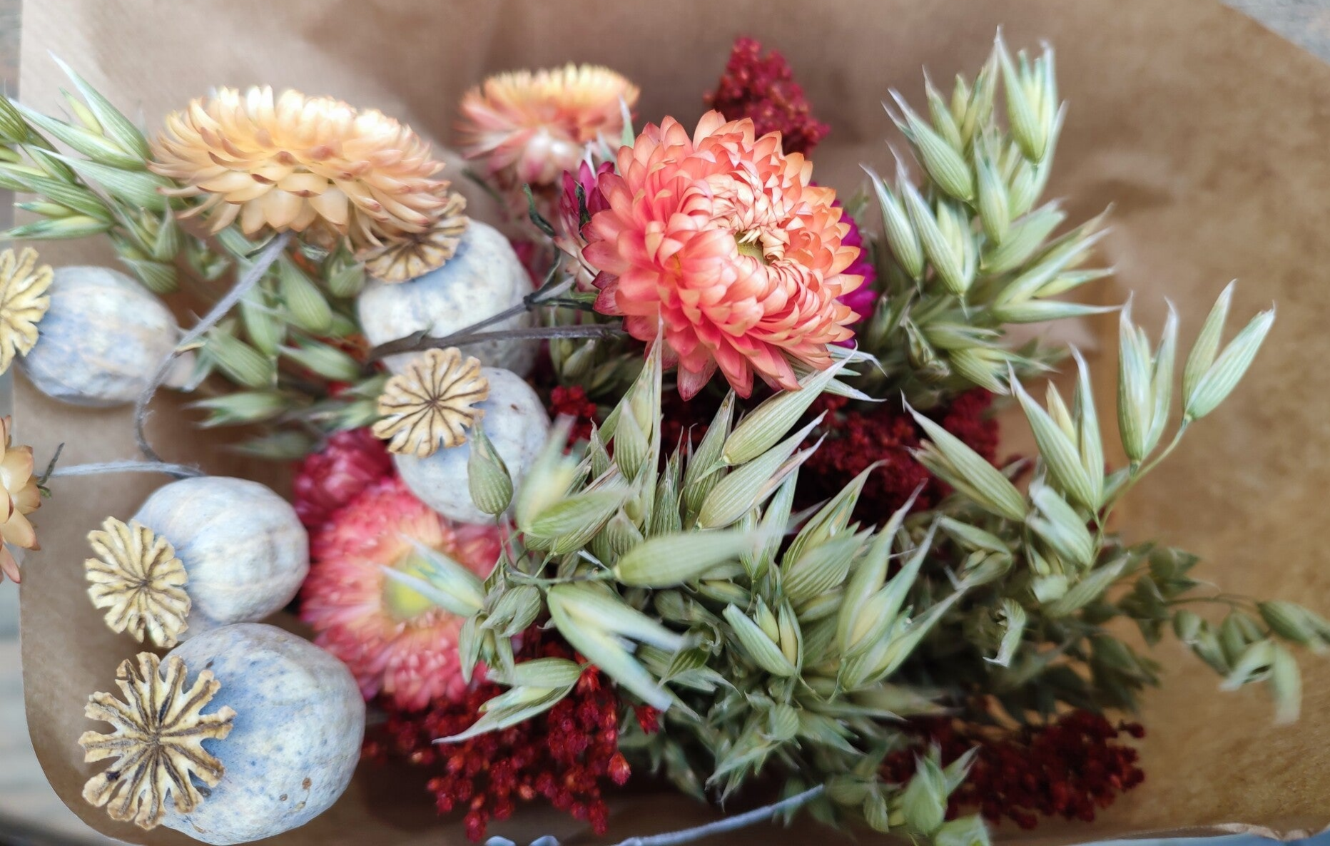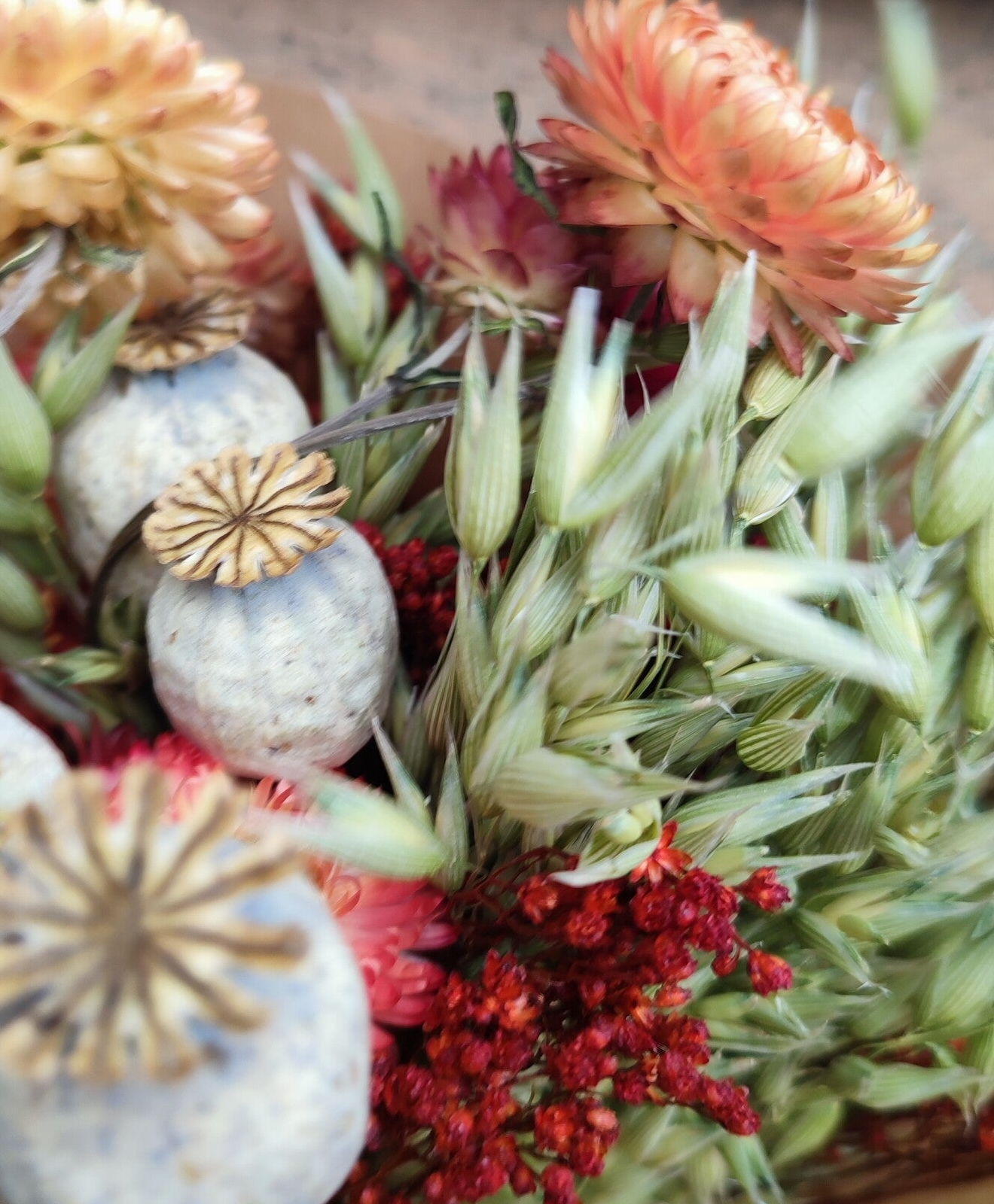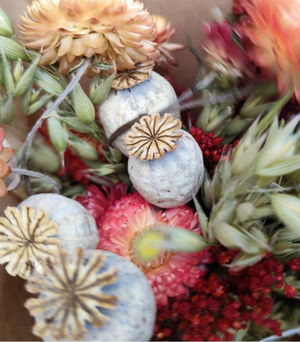 Naturel droogboeket met accenten van zacht oranje rood, met oa. Gedroogde papaver,haver,helychrisum.