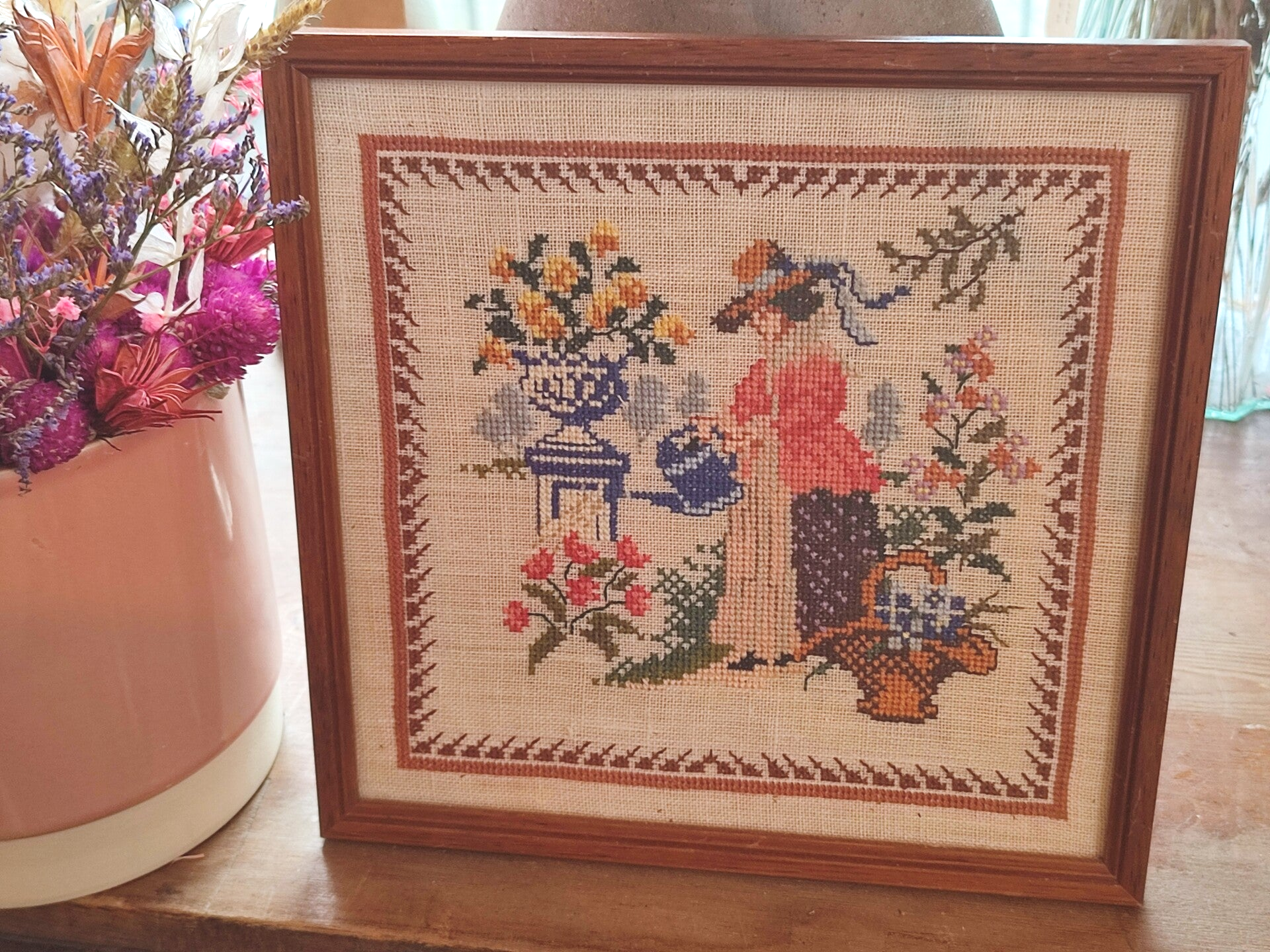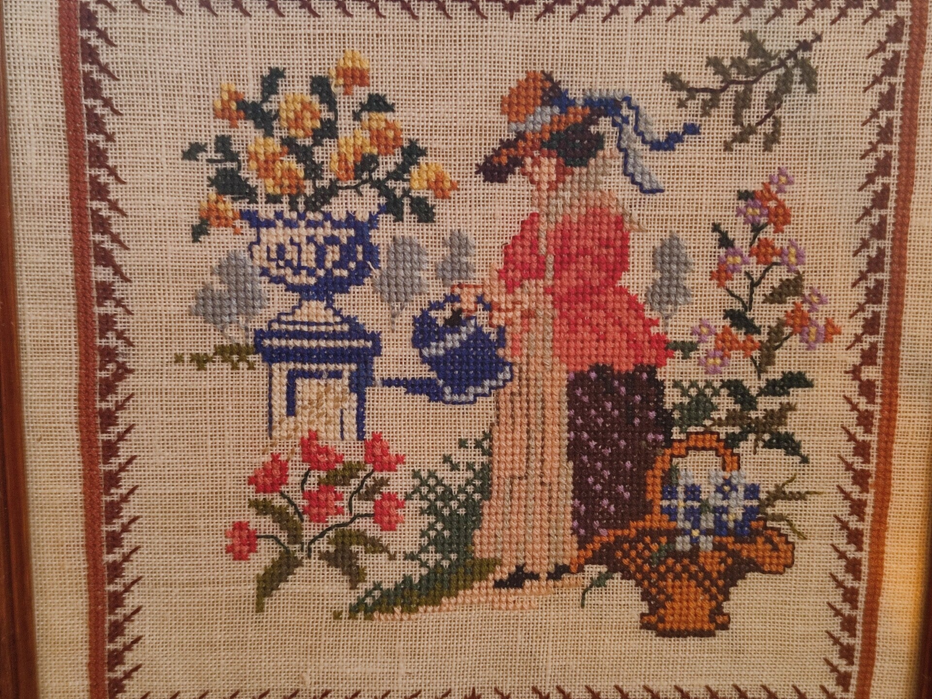 Vintage houten kader met geborduurd handwerk.