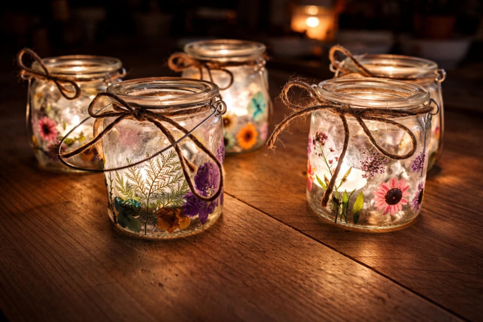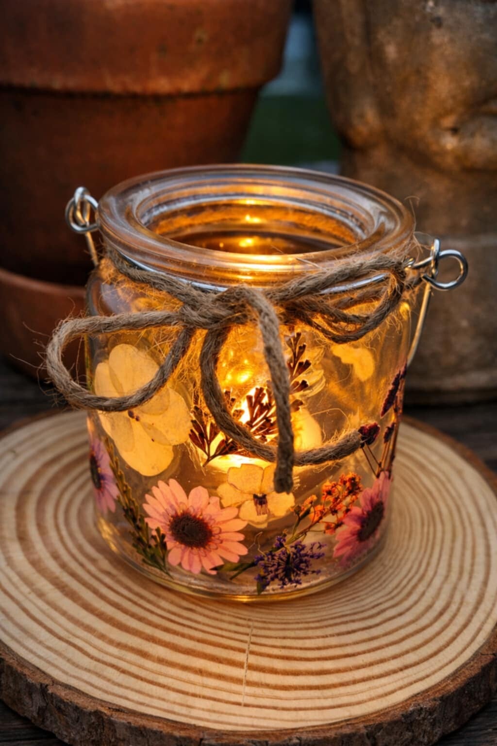 - Maak een mooie glazen theelichthouder met geperste bloemen